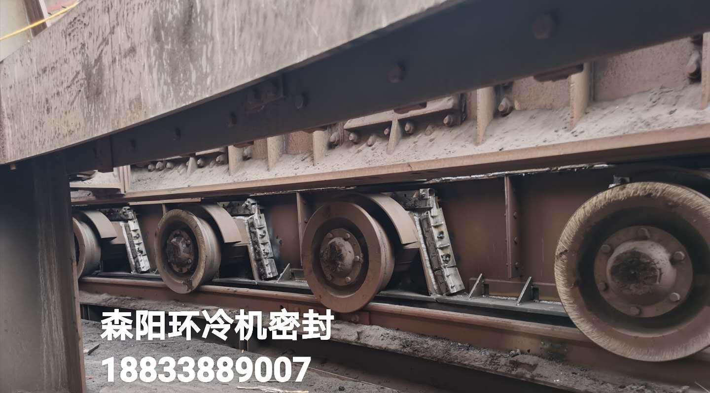 密封采用彈性可自調結構??筛鶕h(huán)冷臺車(chē)跑偏情況進(jìn)行彈性調整。對環(huán)冷機底梁、臺車(chē)輪、三角梁、煙罩等位置進(jìn)行有效密封。煙罩部分采用水槽式密封結構,保證煙罩圈梁始終在水槽密封內運行。密封后有效改善現場(chǎng)噴料、漏風(fēng)。改善現場(chǎng)環(huán)境,提高煙氣溫度,從而增加了發(fā)電量。